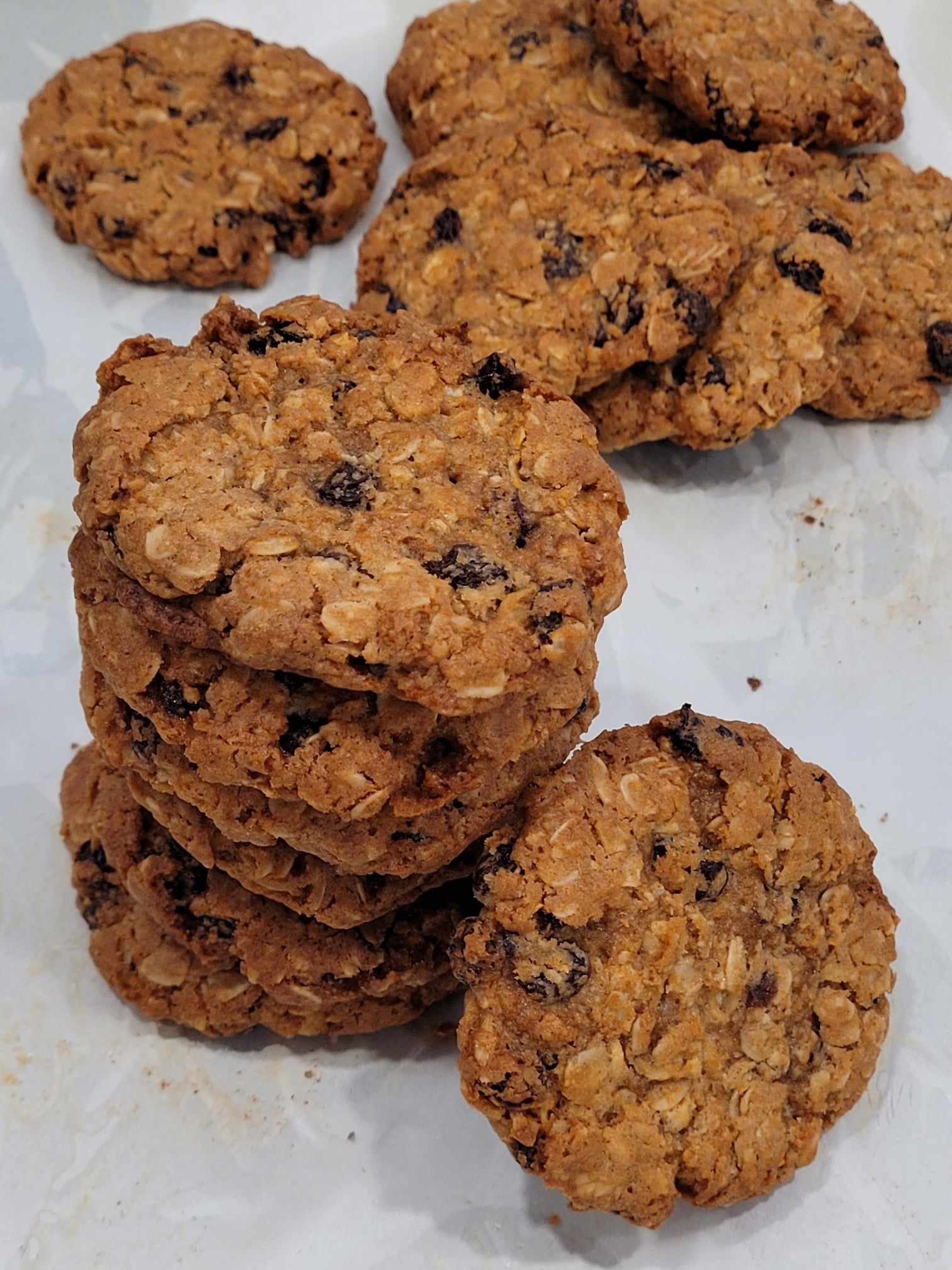 Gros flocons d’avoine, beurre (lait), sucre (cassonade, sucre de canne), farine de blé, raisins Thompson (raisins, huile végétale non hydrogénée), oeufs, poudre levante, sel de mer, extrait de vanille, cannelle, gingembre en poudre.