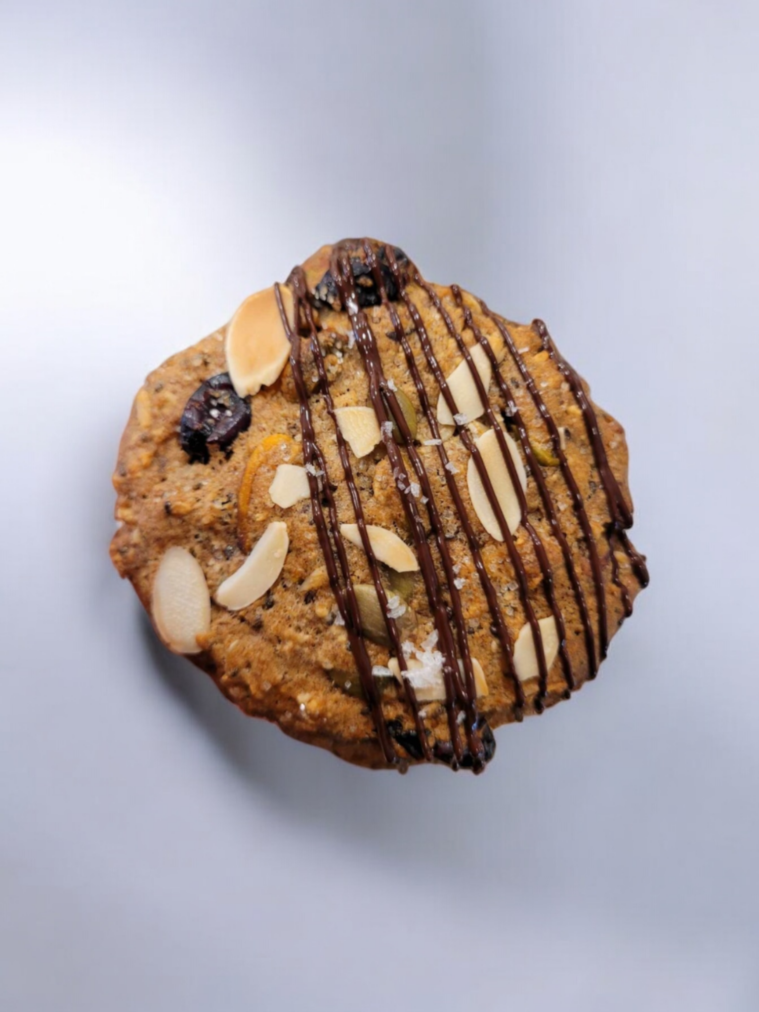 Ingrédients: levain (farine de blé, eau), flocons d’avoine, sucre (cassonade, sucre de canne), pistaches, canneberges séchées (canneberges, sucre de canne, huile de tournesol), farine 12 grains (blé concassé, lin brun, semoule de mais, orge mondé concassé, seigle concassé, triticale concassé, flocons d’avoine, riz brun concassé, sésame naturel, sarrasin concassé, millet, blé durum concassé), graines de tournesol, blé malté torréfié concassé, farine d’amandes, huile d’olive, graines de citrouille, graines de chia, chocolat noir 70%, extrait de vanille, bicarbonate de soude, poudre à pâte, cannelle, sel de mer